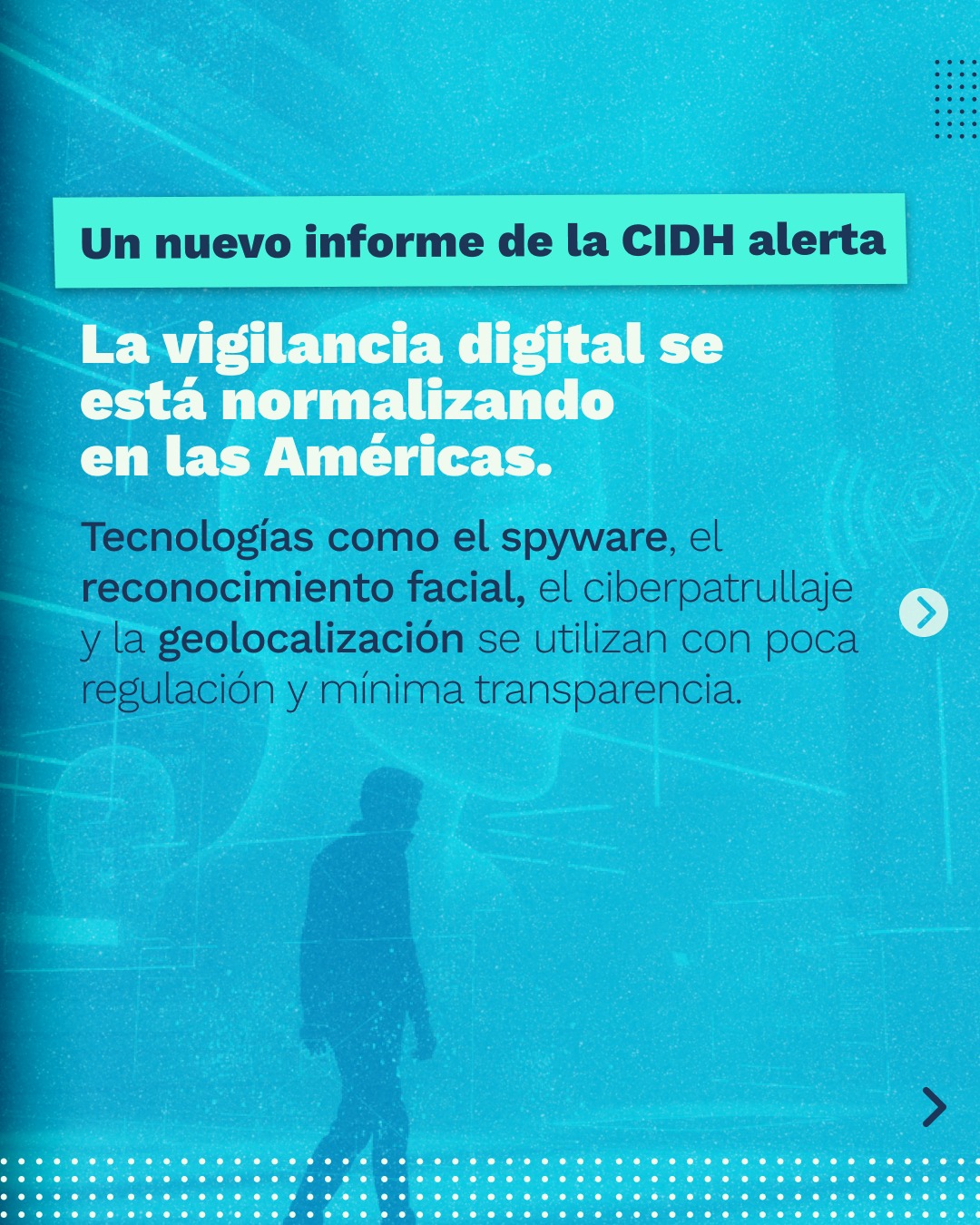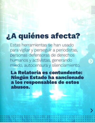 La Relatoría Especial para la Libertad de Expresión de la Corte Interamericana de Derechos Humanos documentó cómo las prácticas de vigilancia digital han sido usadas para vigilar y perseguir a periodistas, personas defensoras de derechos humanos y activistas, generando miedo, autocensura y debilitando el debate público. A la fecha, ningún Estado ha sancionado a los responsables de estos abusos.